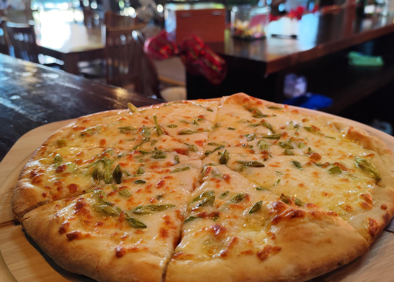 Cebolla, chile verde, aceitunas negras, tomate fresco, hongos, salsa de tomate, mozzarella.
