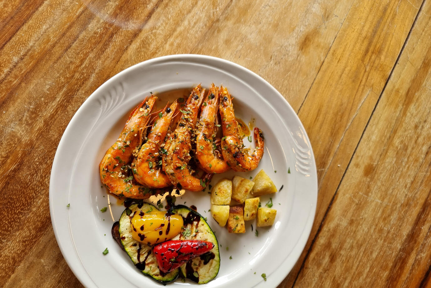 (Res, pollo, camarones, vegetales, papas al romero.)