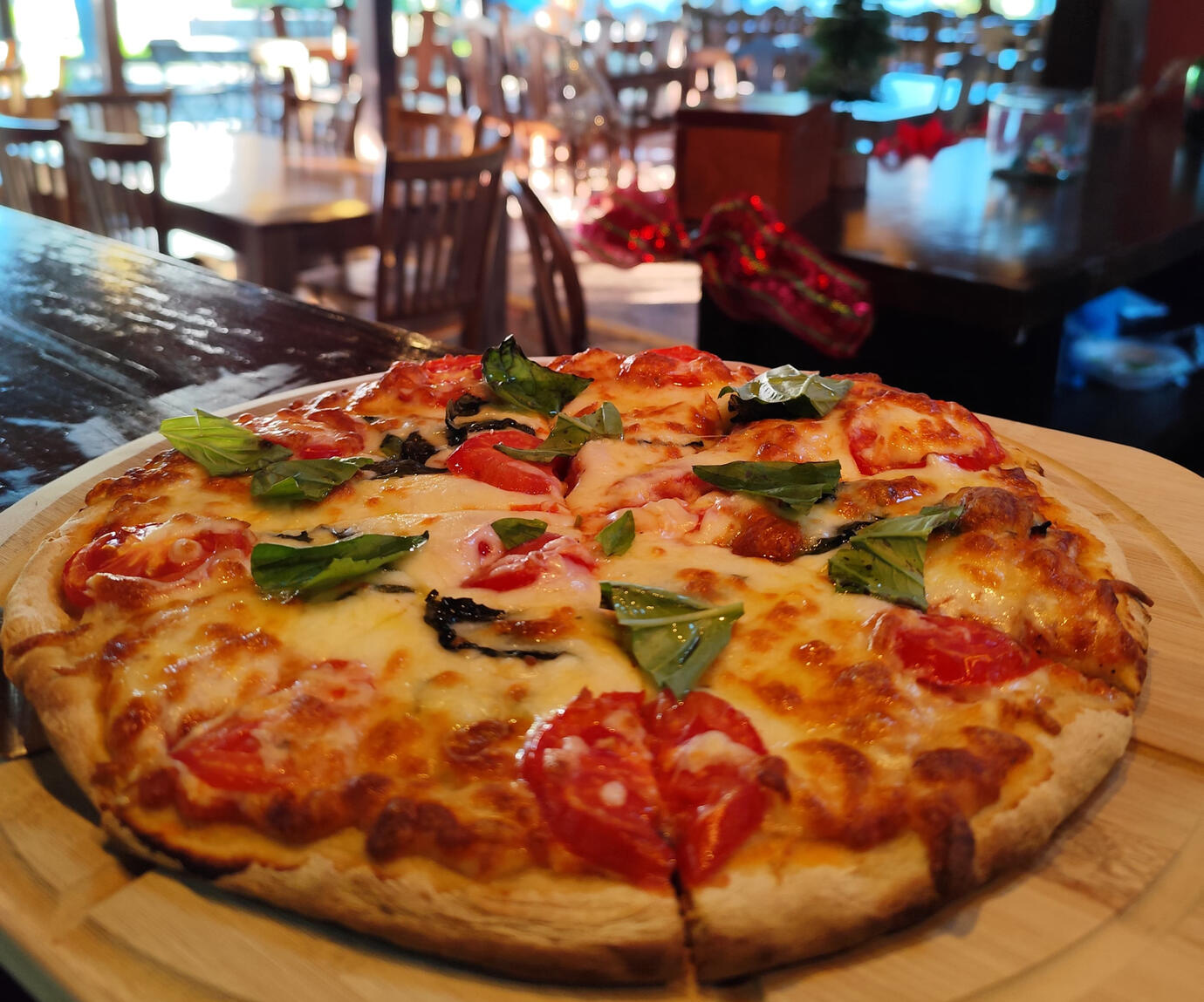 Tomate fresco, albahaca, orégano, mozzarella, salsa de tomate, aceite de oliva extra virgen.