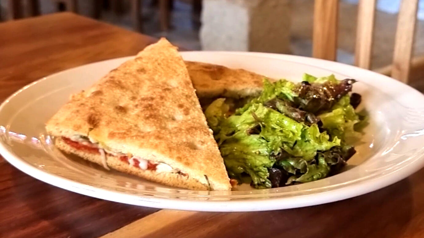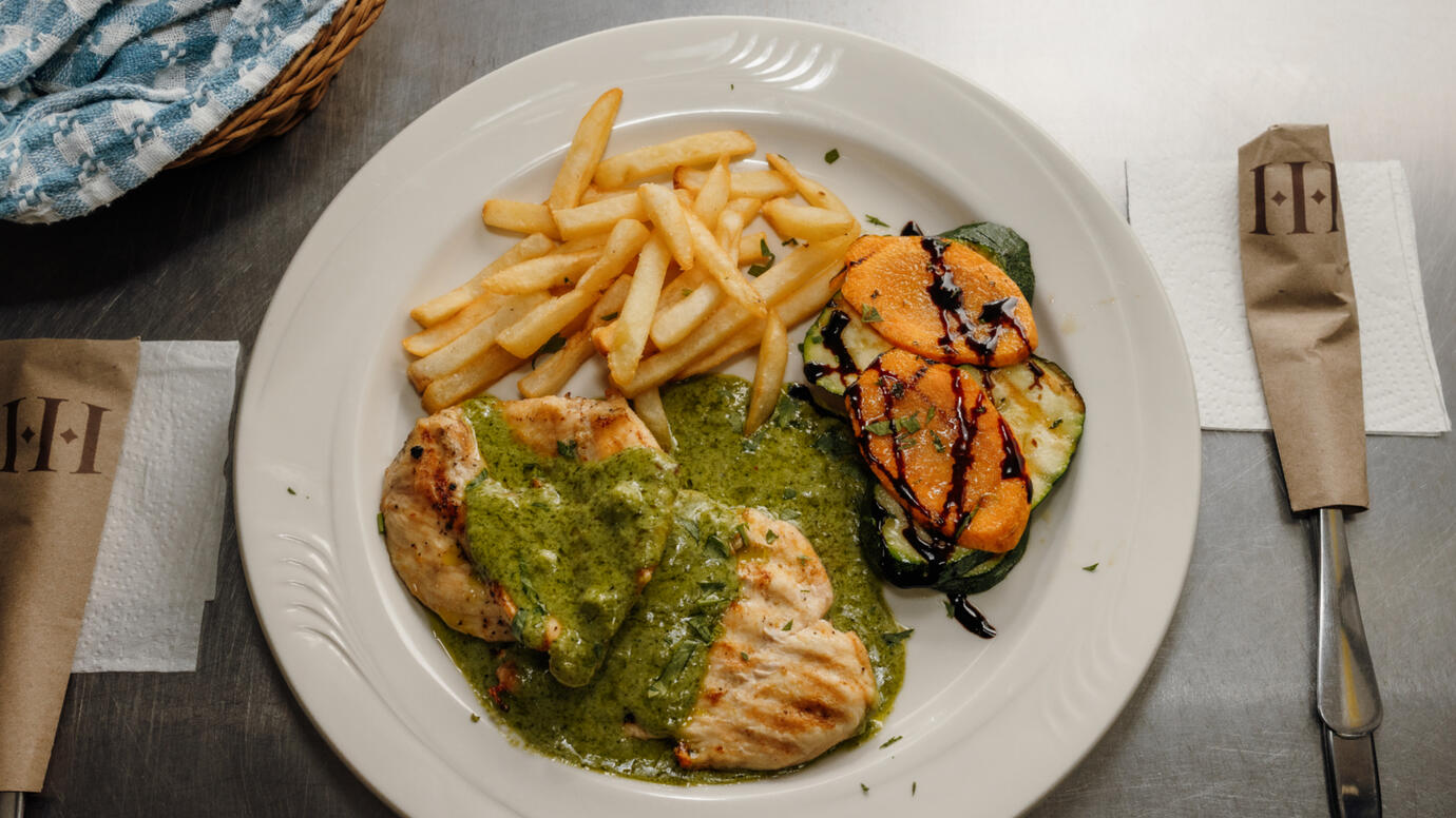 (Pollo sofrito de pomodoro, pesto, mozzarella acompañada con ensalada fresca.)
